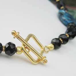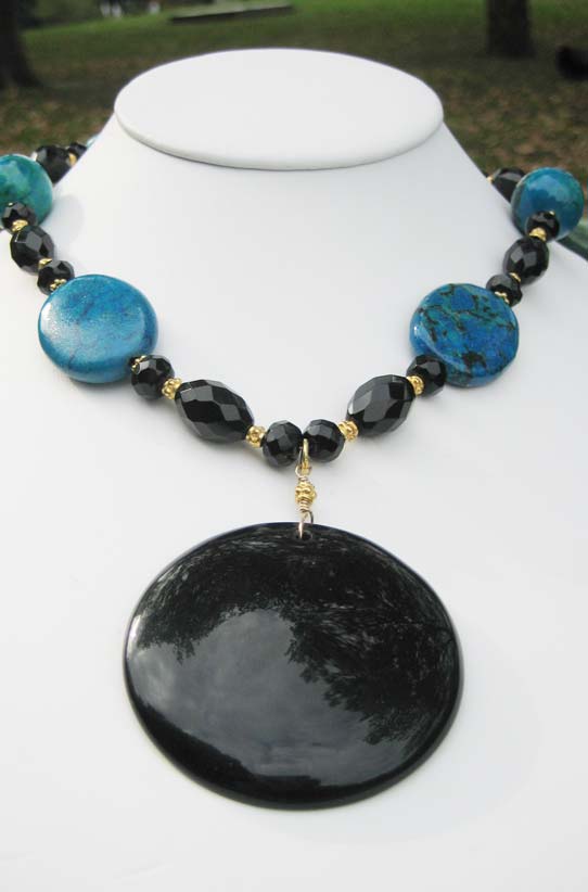 Chrysocola (rare form of striated Jade in bold green and blues hues), onyx and vermeil sets off a 2" diameter round onyx pendant. 20"