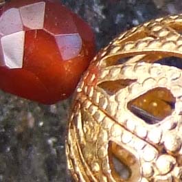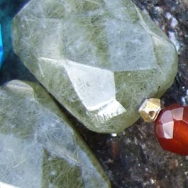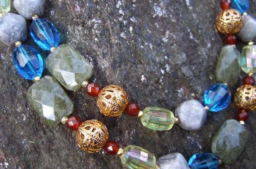 Labradorite and carnelian with English blue topaz glass, gold vermeil nuggets, marbelized Italian ceramic beads, vintage Lucite and metal filigree. Gold vermeil hook & eye closure. Wear long (32") or double.