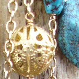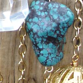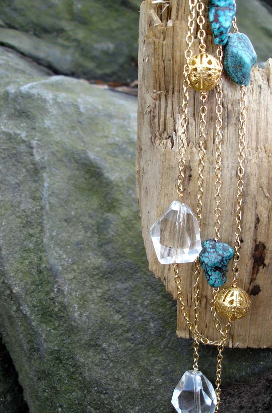 Large clear crystal quartz, turquoise and metal filigree hand wrapped on gold-filled chain.