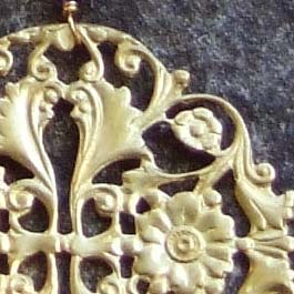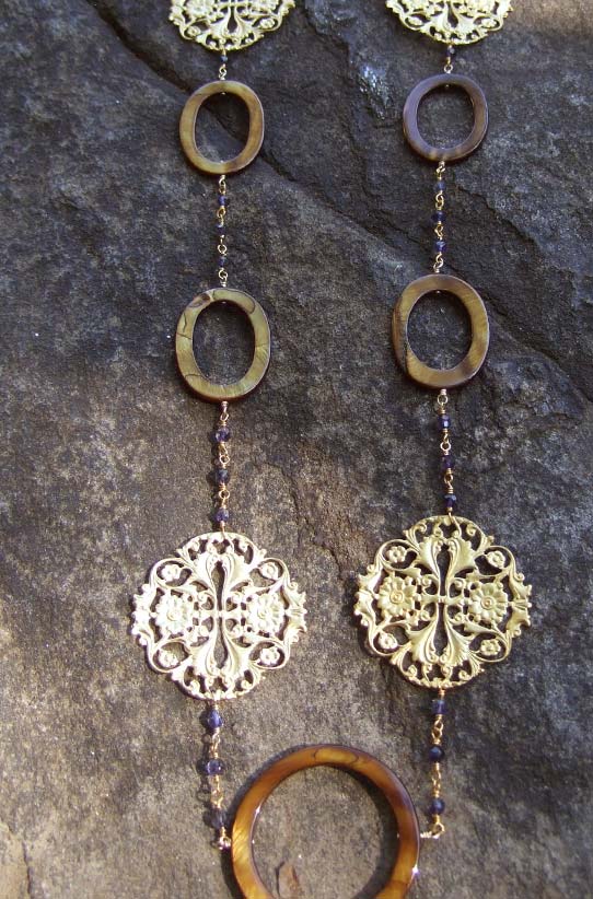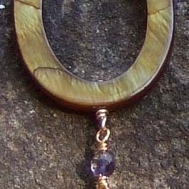 Brown shell ovals with gorgeous, vintage brass filigree and deep blue iolite stones. Hand-wrapped.