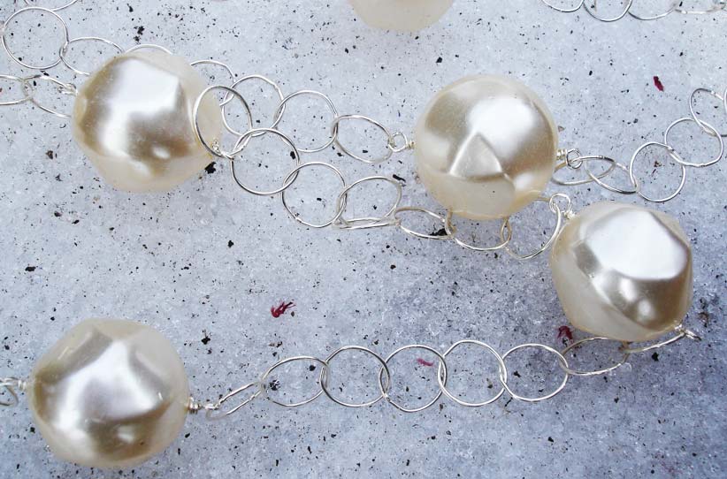 Sterling silver or gold-filled round link chain with large, simulated textured pearls.