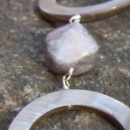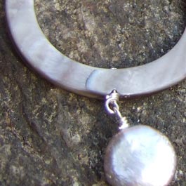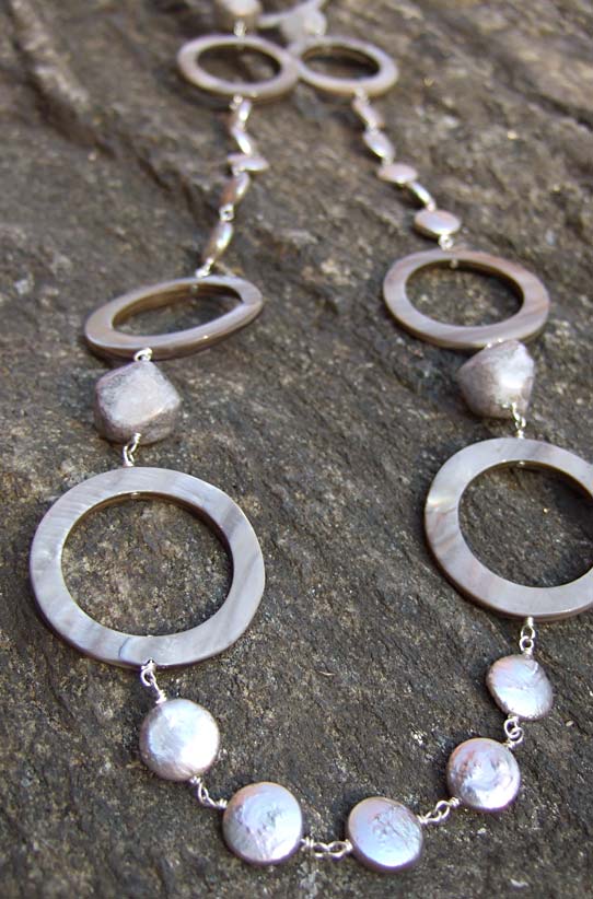 Light silver coin pearls; light silver shell hoops. Handwrapped with sterling silver wire. Approx. 40" Can be worn long or doubled over the head.