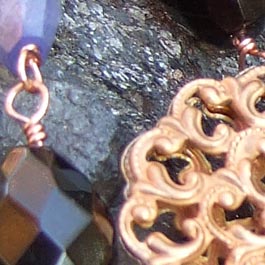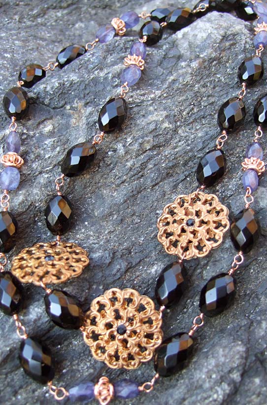 Vintage copper filigree with faceted onyx, iolite and copper beads. Handwrapped with coopper wire. Approx. 30"