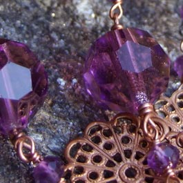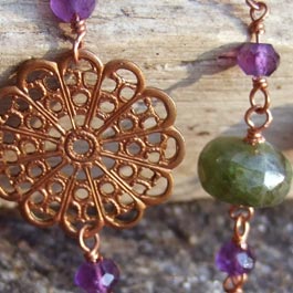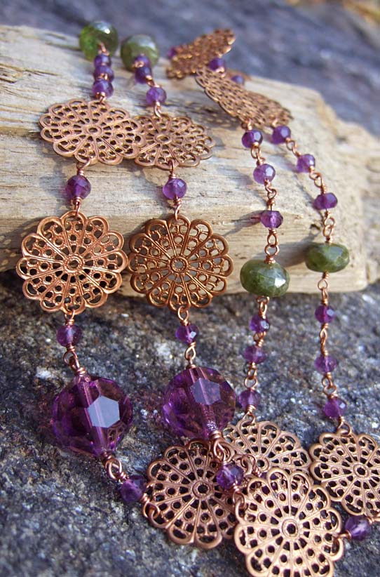 Vintage copper filigree with gorgeous vintage Czech glass (purple), amethysts and rough green garnet. Handwrapped with copper wire. Approx. 29" inches. Can be doubled with an extender.
