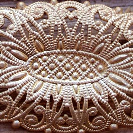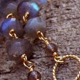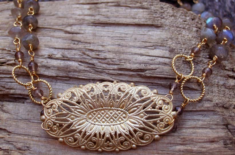 Double-strand labradorite with gold vermeil loops and vintage filigree centerpiece. Handwrapped. Approx 20"