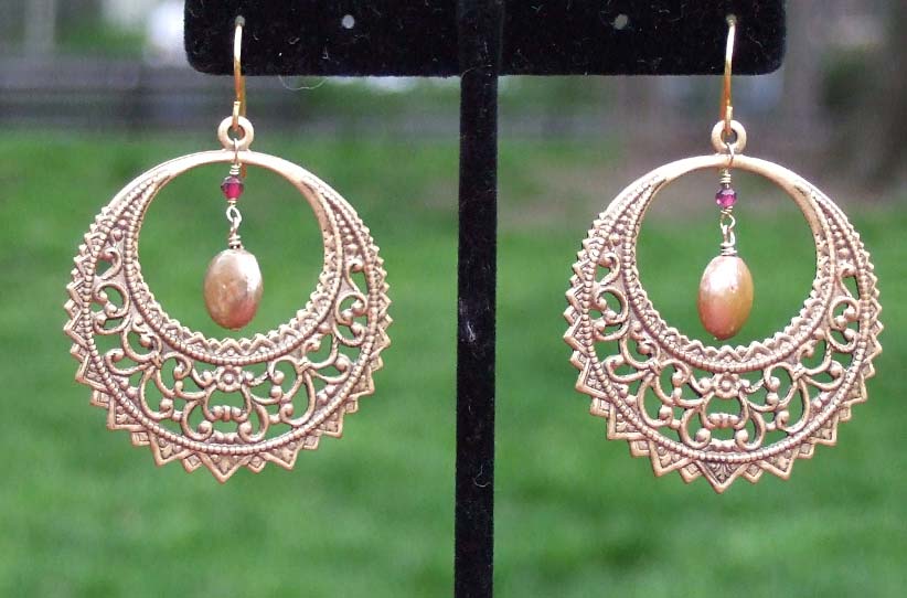 Filigree hoop & freshwater pearl drops. 1.75" diameter.