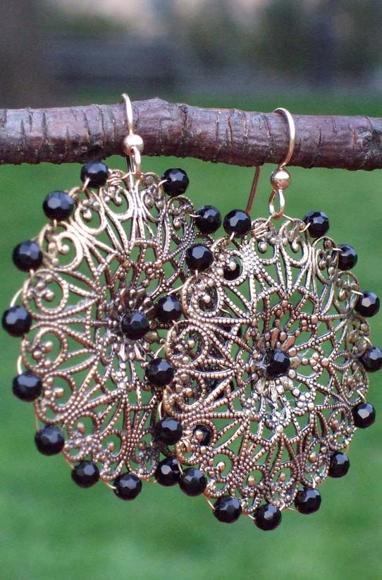 Vintage filigree & onyx earring, 1.75" diameter.