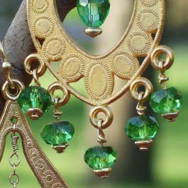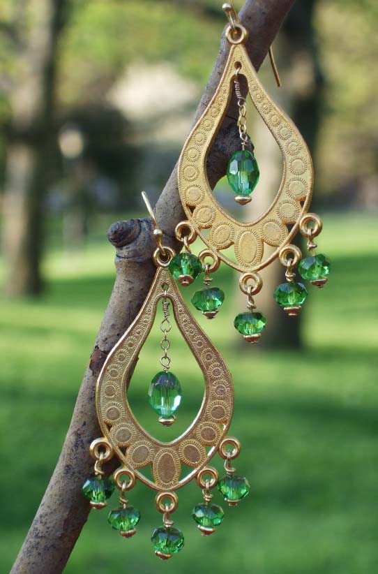Gold chandelier earring. 2.5" from top of ear wire. Green glass drops.