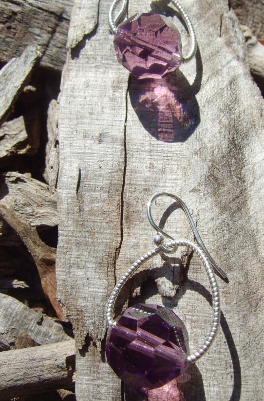 Textured sterling silver hoop with vintage Amethyst Swarovski crystals. Sterling silver French earwire.
