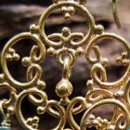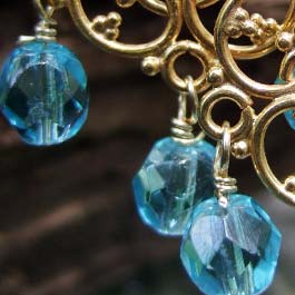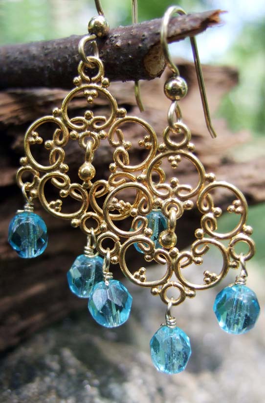 Gold vermeil filigree with vintage aqua crystal drops. Gold-filled French earwire.